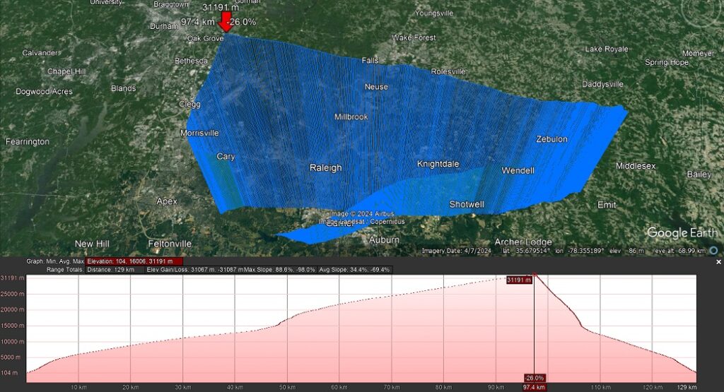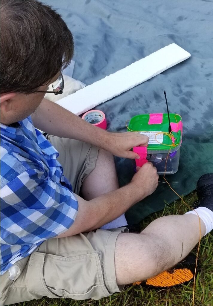July 14, 2024; Matthew, Sarah, and Paul L. met up with the group from NSL-93 at Lake Wheeler Park, south of Raleigh. This was another flight to test of experiments for the Civil Air Patrol. It was to be a very hot day, so they started at 0700EDT with hopes to launch and recover in the morning. The flight path prediction showed it landing only a mile or two east of the launch site.