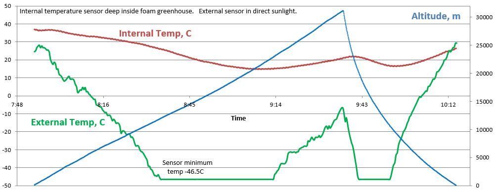Ascent/descent rate data. Temperature data – note the inside stayed toasty due to the black foam inside the clear container.